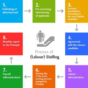 Temporary staffing, or employee leasing, is a form of employment where a temp agency (Leasing company) makes a contract with the employee instead of the employer (Subscribing firm) and takes over the employer’s administrative duties for that employee (resignation, employment, notice in Hungarian Uniform Labor Database, paying of wages, etc.). But the actual work of the employed person is overseen by the employer. This means things such as scheduling work plans, lunch time, detailed tasks, etc., are managed by the employer.